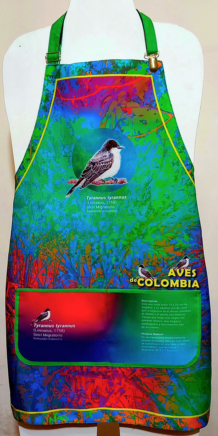 Delantal Aves de Colombia. Motivo Sirirí. Elaborado en tela reciclada tipo dril antifluidos. Adaptable a todas las tallas.