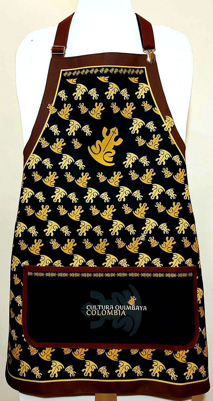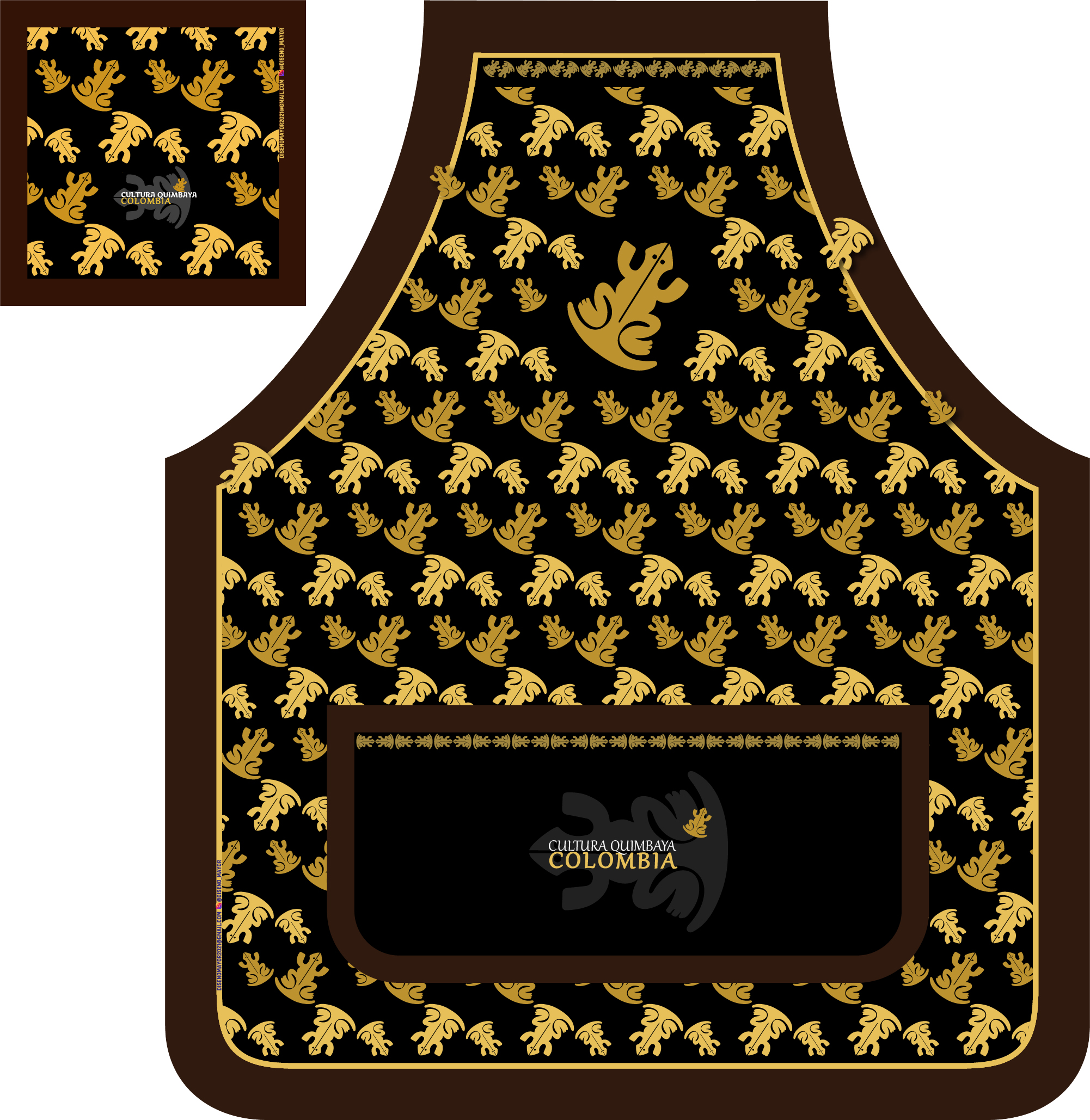 Delantal Cultura Quimbaya. Elaborado en tela reciclada tipo dril antifluidos. Adaptable a todas las tallas.