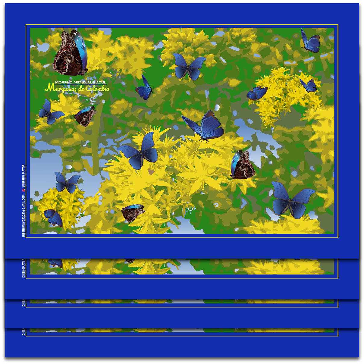 Individual Mariposas de Colombia. Motivo: Mariposa Morpho Menelaus Azul 1. Elaborado en telas recicladas tipo dril, forrado en tela tipo lona unicolor. Tamaño: 38 x 28 cms