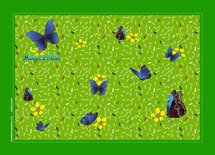 Individual Mariposas de Colombia. Motivo: Mariposa Morpho Menelaus fondo Verde. Elaborado en telas recicladas tipo dril, forrado en tela tipo lona unicolor. Tamaño: 38 x 28 cms