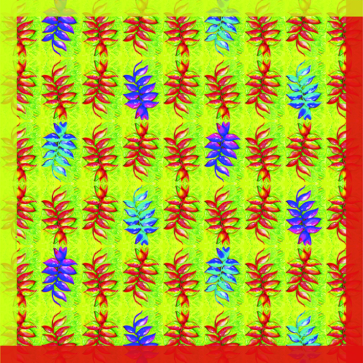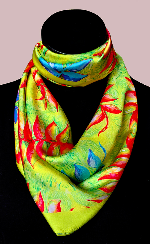 Pañoleta Flores nativas – Heliconias 1 (Flor de platanillo). Elaborada en seda industrial tipo Satín, semibrillante suave al tacto. 85 x 85 cms