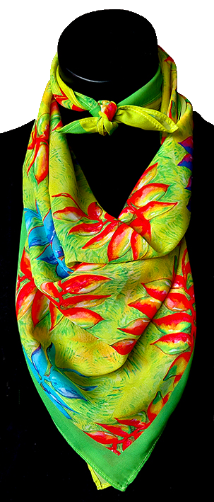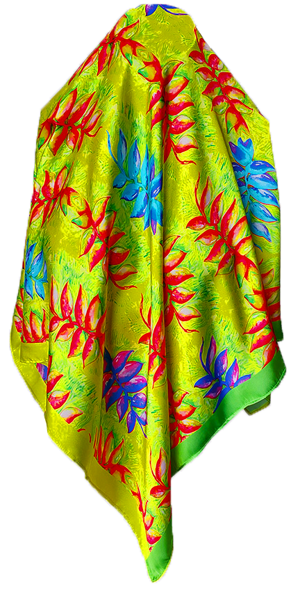 Pañoleta Flores Nativas – Heliconias (Flor de platanillo). Elaborada en seda industrial tipo Satín, semi-brillante, suave al tacto. 85 x 85 cms